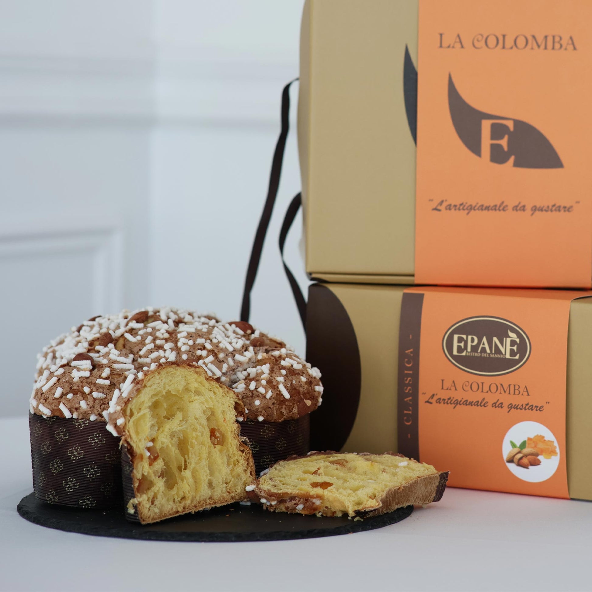La colomba pasquale di Epanè è un pane dolce tipico della tradizione italiana, preparato con ingredienti di alta qualità e con la ricetta autentica simile al panettone ma a forma di colomba. Una delizia soffice, con lunga lievitazione e profumata, canditi selezionati e profumati perfetta per festeggiare la Pasqua in famiglia o per regalarti un momento di dolcezza con amici e familiari;